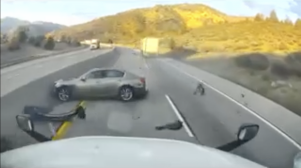 In the video, you can see a small silver car sneak between the dash cammer in the left lane and a second truck hauling double trailers in the right lane. The car driver loses control and strikes the truck in the right lane. The crash causes the double to trailers to swing, but the truck stays upright.